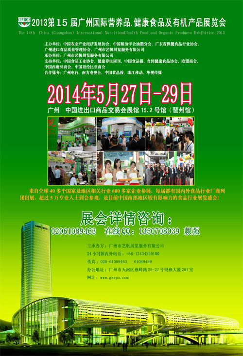 - 不久前[展會(huì)] 2014第15屆中國(guó)廣州國(guó)際營(yíng)養(yǎng)品.健康食品及有機(jī)產(chǎn)品展覽會(huì)