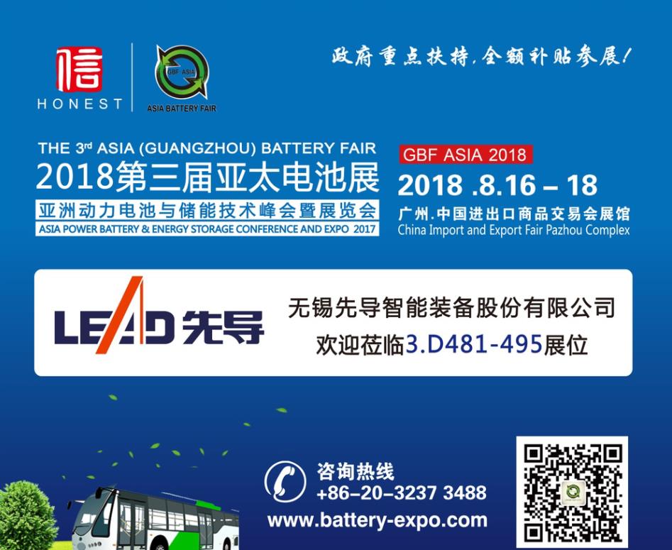 無錫先導(dǎo)智能裝備股份有限公司 將隆重出席8月16-18日在廣州琶洲.廣交會(huì)展館A區(qū)舉辦的GBF.ASIA 2018第三屆亞太電池展。