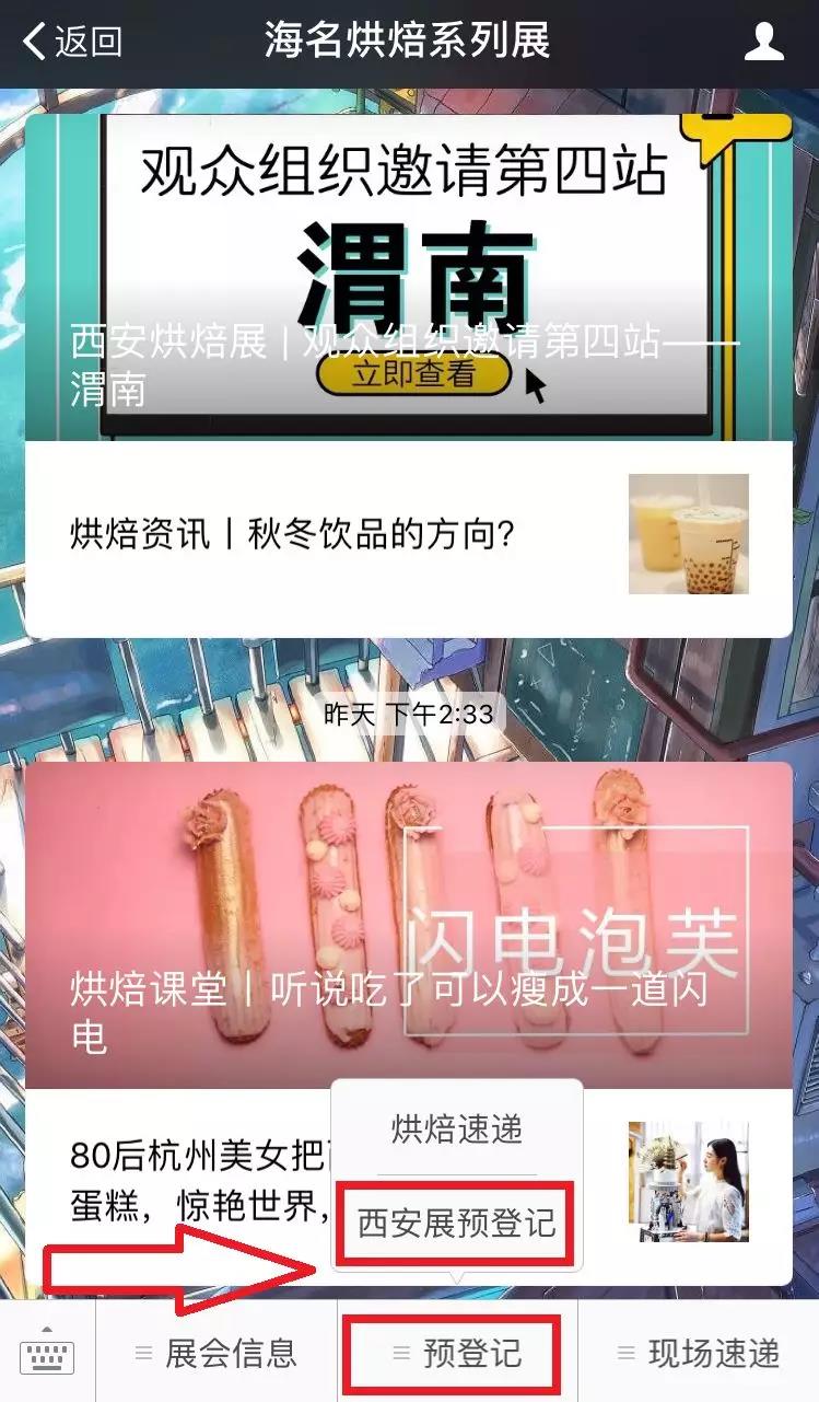 2、點(diǎn)擊微信菜單【預(yù)登記】的西安展預(yù)登記即可直接使用微信在線預(yù)登記服務(wù)