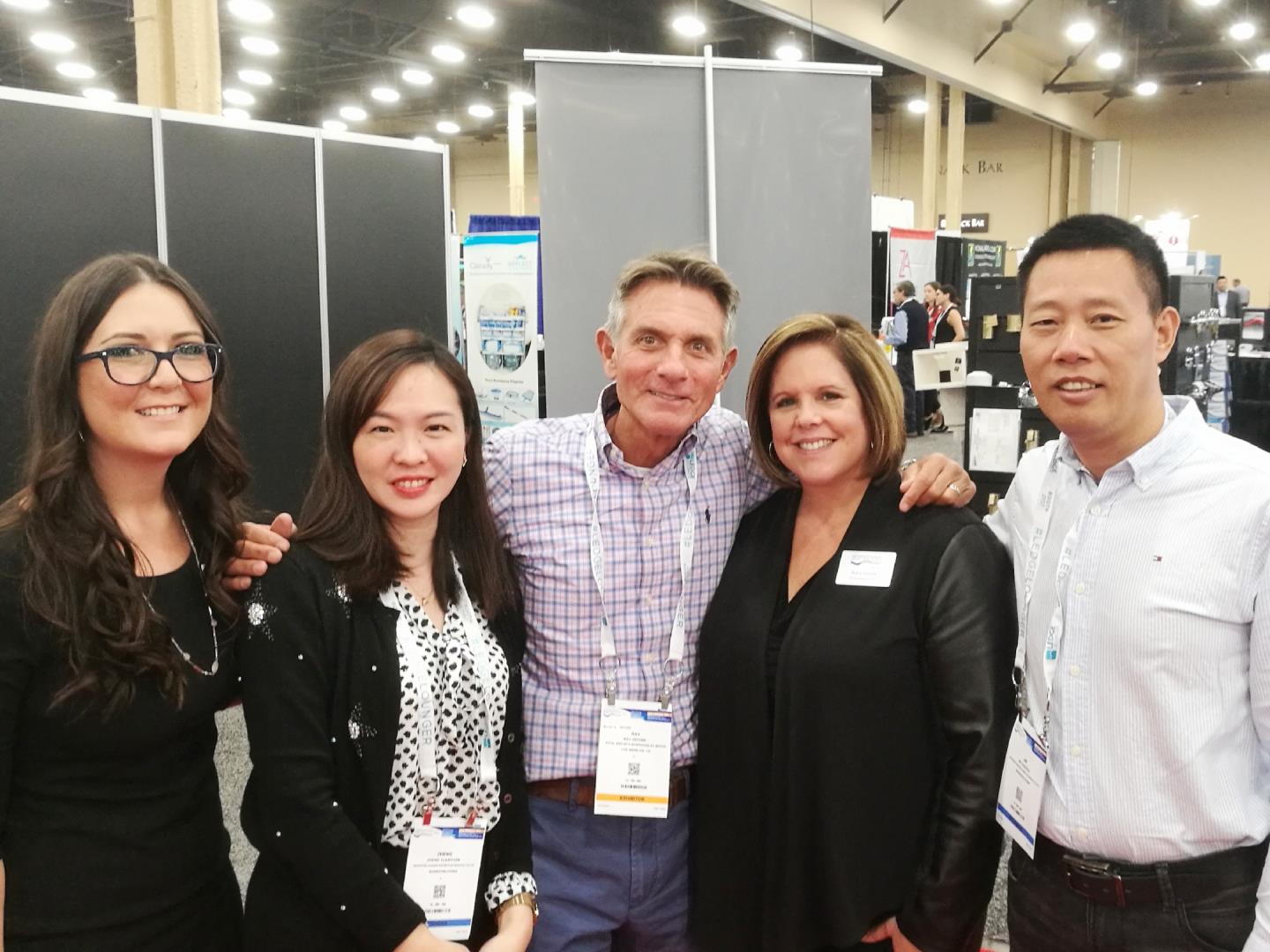 CSE國(guó)際部經(jīng)理 鄭元元(左二)CSE項(xiàng)目總經(jīng)理 靳朝貴(右一)與美國(guó)泳池展主辦方合照