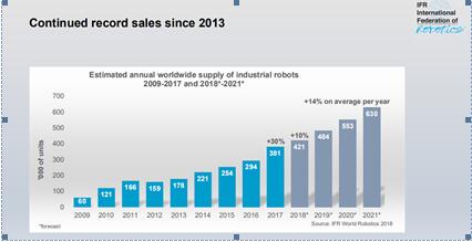 今年10月,國(guó)際機(jī)器人聯(lián)盟(IFR)在日本東京舉行的“World Robot Summit 2018”記者招待會(huì)上公布了每年都會(huì)發(fā)行的“The World Robotics Report”,根據(jù)報(bào)告顯示,全球工業(yè)用機(jī)器人領(lǐng)域投資將持續(xù)增加。從2013年到2017年,全世界工業(yè)用機(jī)器人的銷量增加了2倍,2018至2021年,年平均增長(zhǎng)率為14%。汽車(chē)、電子、金屬工業(yè)等領(lǐng)域機(jī)器人自動(dòng)化的需求持續(xù)增加,不論大企業(yè)還是中小型企業(yè)均對(duì)自動(dòng)化表現(xiàn)出極大的興趣,愿意嘗試借勢(shì)機(jī)器人轉(zhuǎn)型,讓企業(yè)搭上智能制造快車(chē)。