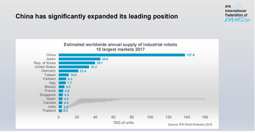 2017年,占據(jù)全球機(jī)器人市場(chǎng)份額73%的5個(gè)國(guó)家依次是中國(guó)、日本、韓國(guó)、美國(guó)、德國(guó)。其中,中國(guó)工業(yè)機(jī)器人的銷量達(dá)到137.9萬(wàn)臺(tái),占據(jù)了世界供應(yīng)量的36%,進(jìn)一步鞏固了第一大市場(chǎng)的位置。2013年至2017年,中國(guó)已連續(xù)五年成為全球最大的工業(yè)機(jī)器人應(yīng)用市場(chǎng)。據(jù)預(yù)計(jì),到2020年我國(guó)機(jī)器人市場(chǎng)規(guī)模將進(jìn)一步擴(kuò)大到2000億元,工業(yè)機(jī)器人發(fā)展一片“火熱”景象。