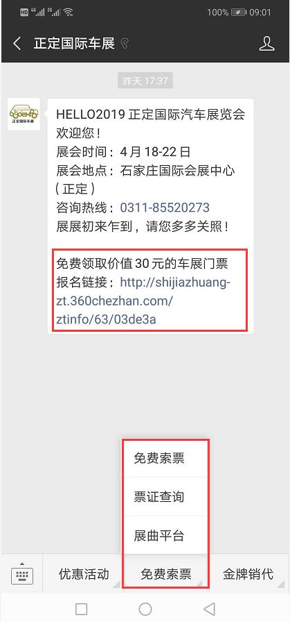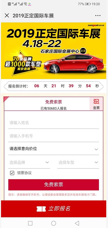 關(guān)注“正定國際車展”微信公眾號,選擇“免費索票”,輸入相關(guān)信息即可免費獲取價值30元的車展門票;或點擊自動回復(fù)報名鏈接進行索票。