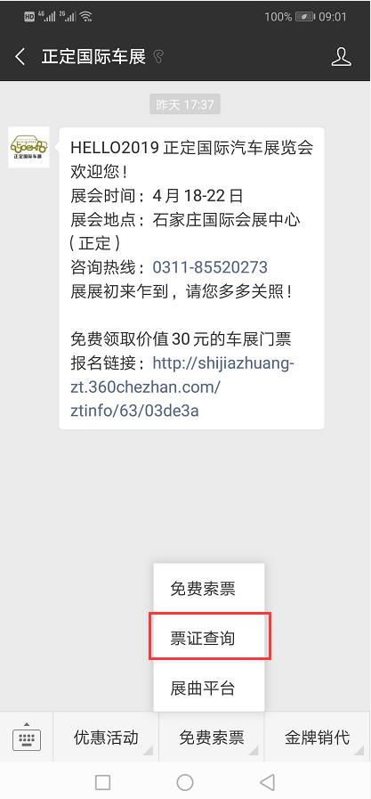 關(guān)注“正定國際車展”微信公眾號,點擊“免費索票”選擇“票證查詢”,輸入相關(guān)信息,即可查票。