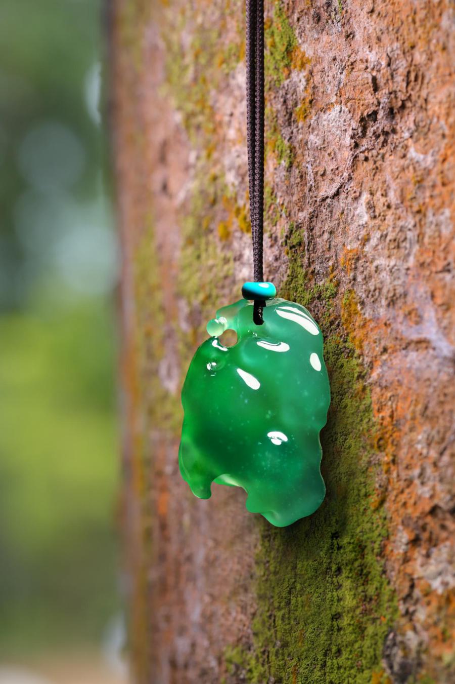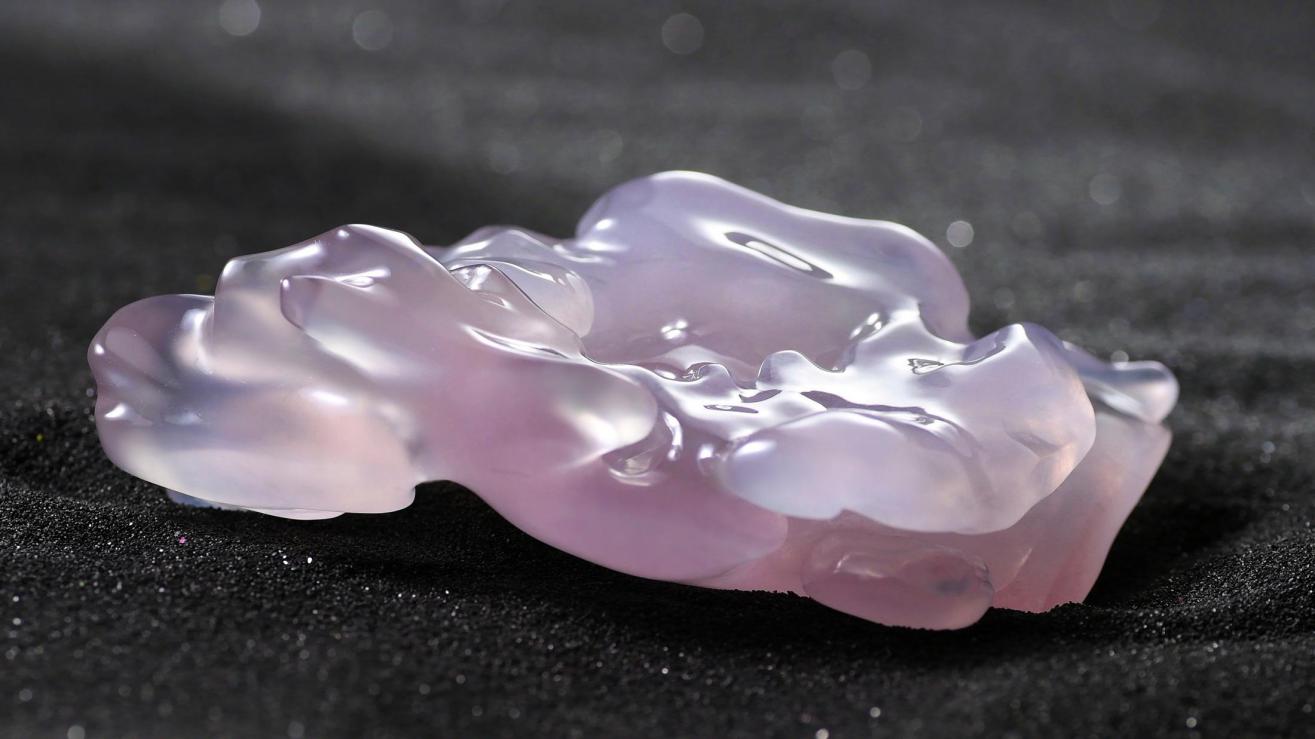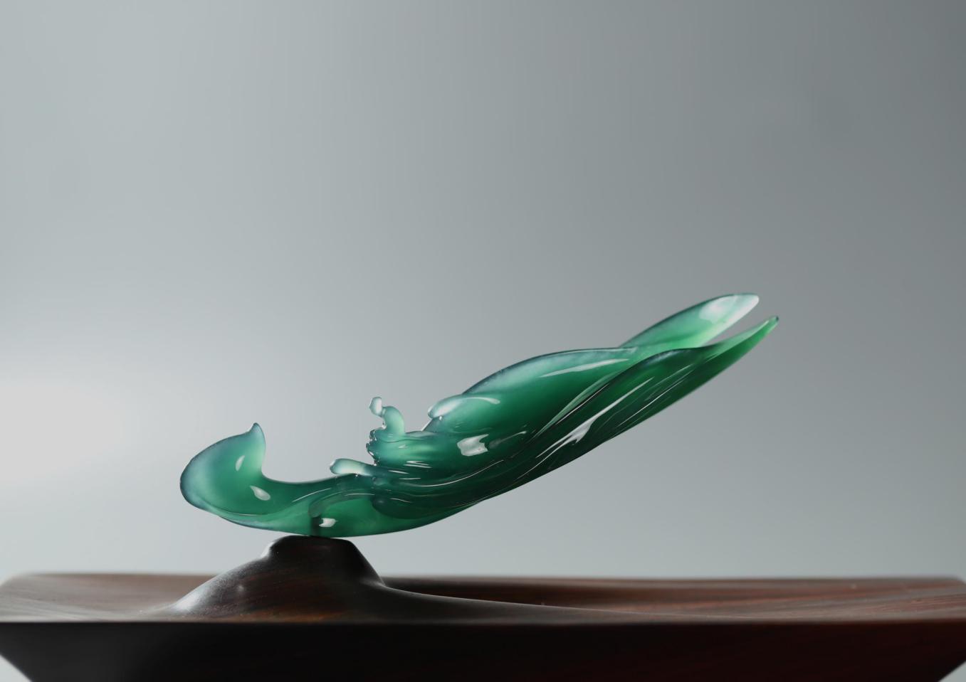 化境系列,意在還原翡翠中自然天成的美感。結(jié)合其質(zhì),形,色,意,以流暢的線條,呈現(xiàn)玉石雅致清逸,意境空明的天然之美。該系列作品造型抽象,在純凈靈透中展現(xiàn)空靈寂靜之美。在清心自由的狀態(tài)中,加以想象,感知,它或是水,是魚,是舞者,是一切生靈……成萬物之法變,應(yīng)無所住而通其心,遂漸入佳境。