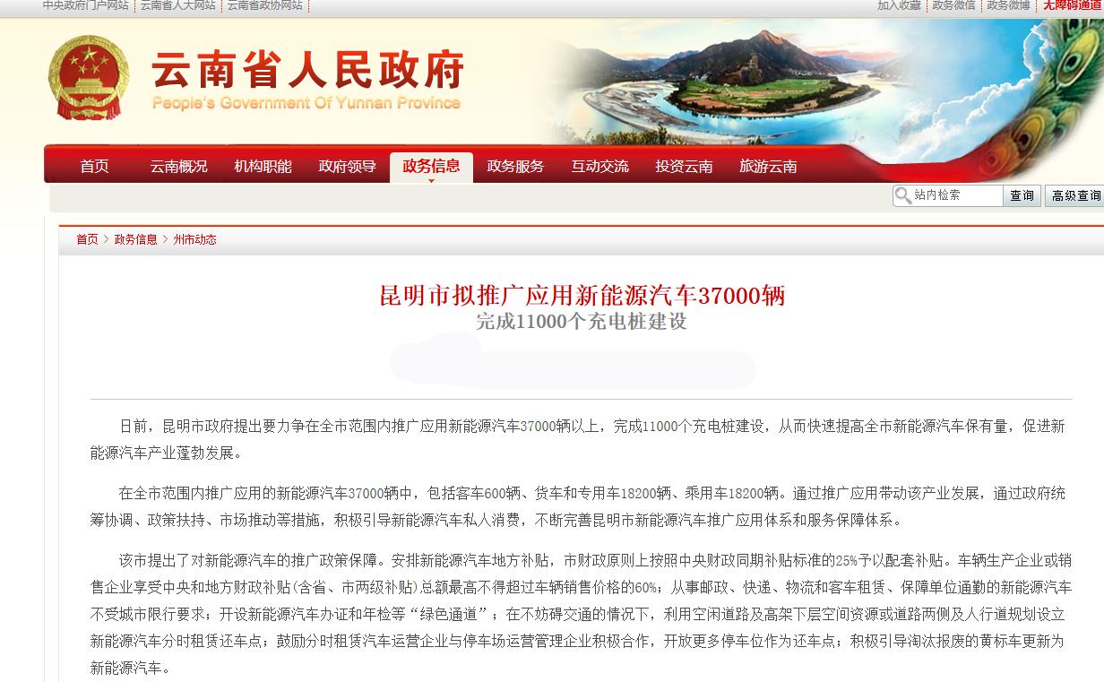 日前,昆明市政府提出要力爭在全市范圍內(nèi)推廣應(yīng)用新能源汽車37000輛,其中包括客車600輛、貨車和專用車18200輛、乘用車18200輛,11000個(gè)充電樁建設(shè),從而快速提高全市新能源汽車保有量,促進(jìn)新能源汽車產(chǎn)業(yè)蓬勃發(fā)展。并推出了一系列對(duì)新能源汽車的推廣的利好政策: