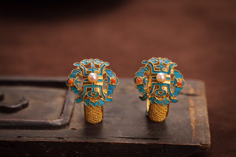 耳環(huán)引用傳統(tǒng)蝙蝠、團(tuán)壽、祥云等吉祥圖案,藍(lán)色部分采用點(diǎn)翠工藝,點(diǎn)綴珍珠等有機(jī)寶石,圈體為手工花絲,整體工藝細(xì)膩,搭配完美堪稱(chēng)完美之作。