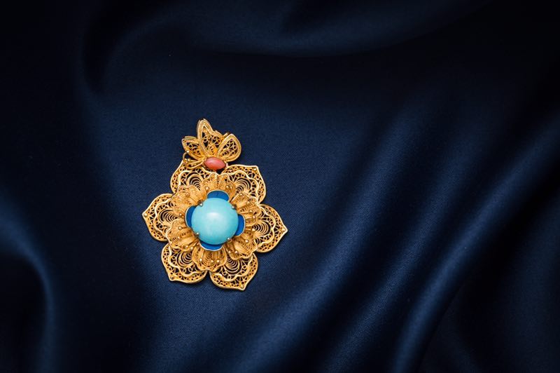 蝴蝶和花面均為手工花絲之作,點(diǎn)綴天然松石和有機(jī)寶石等,整體造型優(yōu)雅美麗,細(xì)膩繁復(fù),富有古韻的時(shí)尚作品。