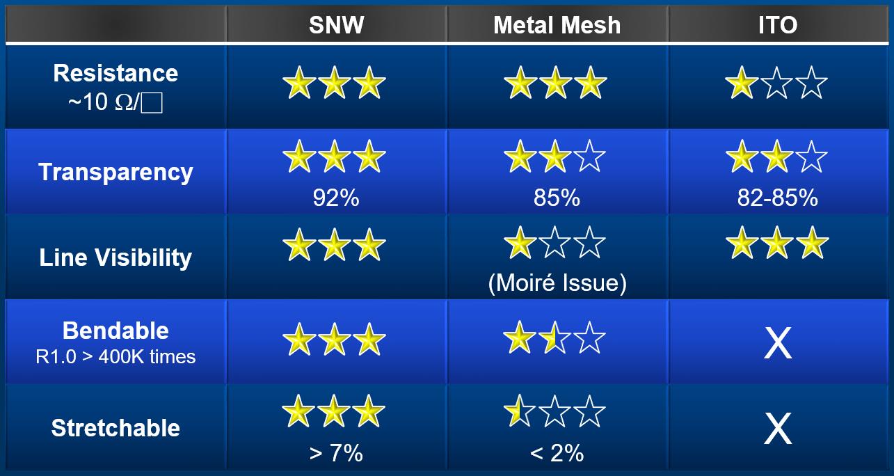 江博士表示,之所以選擇納米銀線,也是多方考慮后選擇的結(jié)果。因?yàn)榧{米銀線相對(duì)于其他柔性觸控材料、如金屬網(wǎng)格、石墨烯等材料,其性能的優(yōu)越性更為全面。