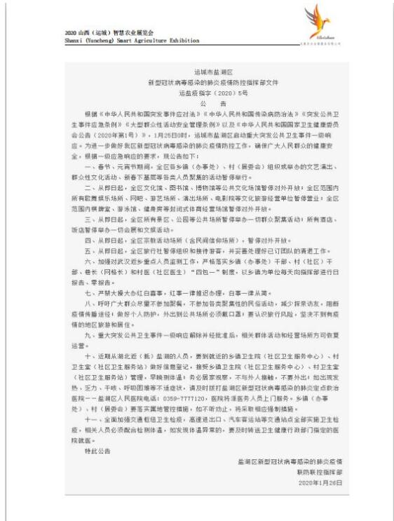 自新型冠狀病毒感染肺炎疫情發(fā)生以來(lái),舉國(guó)上下高度重視,全民全力防控。為響應(yīng)及配合山西省新型冠狀病毒感染的肺炎疫情防控領(lǐng)導(dǎo)小組辦公室的安排部署,貫徹運(yùn)城市鹽湖區(qū)新型冠狀病毒感染的肺炎疫情聯(lián)防聯(lián)控指揮部防控工作的要求,確保各參展商及觀眾的身體健康和生命安全,原定于2020年2月26-27日在運(yùn)城市農(nóng)業(yè)展覽中心召開(kāi)的山西(運(yùn)城)智慧展覽會(huì)將延期舉行。