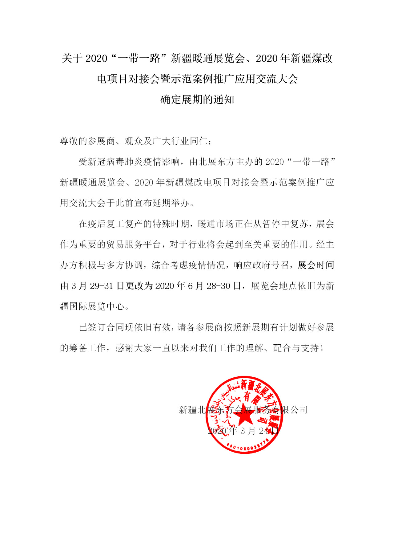 2020“一帶一路”新疆暖通展覽會(huì)、2020年新疆煤改電項(xiàng)目對(duì)接會(huì)暨示范案例推廣應(yīng)用交流大會(huì),現(xiàn)確定最新展期時(shí)間為2020年6月28日-30日,展覽會(huì)地點(diǎn)依舊為新疆國(guó)際會(huì)展中心。
