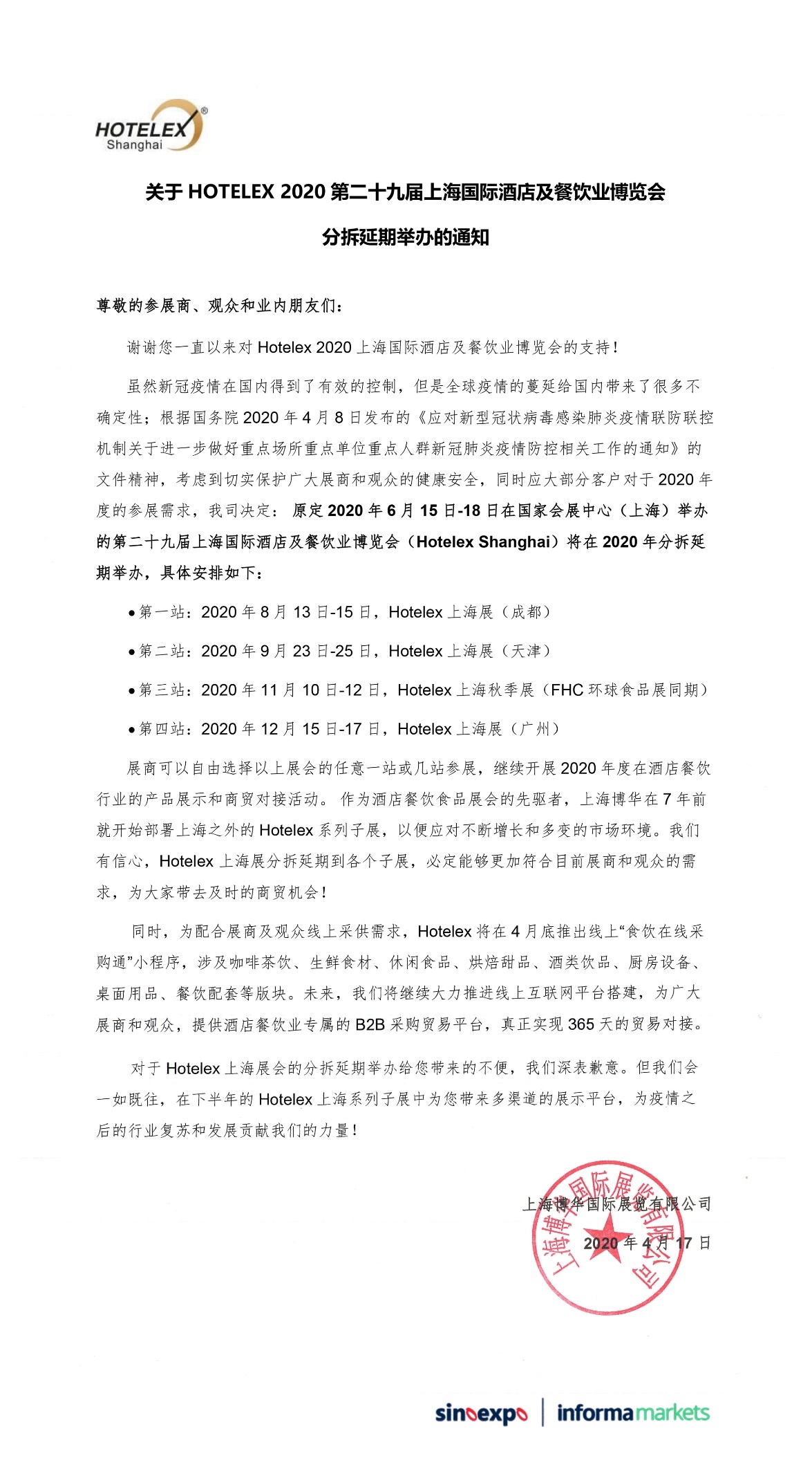 第二十九屆上海國際酒店及餐飲業(yè)博覽會分拆延期通知