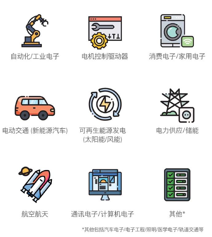 功率半導(dǎo)體元件及模塊、集成電路、無源元件、電磁及磁性材料、散熱管理、傳感器、裝配和子系統(tǒng)、電氣傳動、功率轉(zhuǎn)換器、電能質(zhì)量&儲能、測試&測量、軟件開發(fā)、信息及服務(wù)