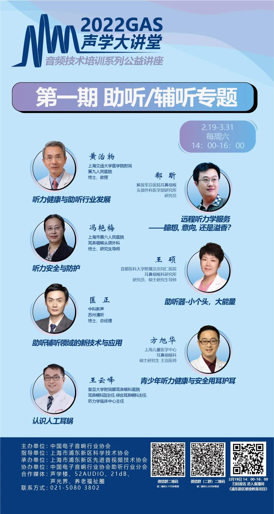 2022年2月19日下午2點(diǎn),協(xié)會(huì)將正式舉辦《2022GAS聲學(xué)大講堂—音頻技術(shù)培訓(xùn)系列公益講座》啟動(dòng)大會(huì),來自上海交通大學(xué)醫(yī)學(xué)院附屬第九人民醫(yī)院的黃治物教授為大家分享《聽力健康與助聽行業(yè)發(fā)展》。