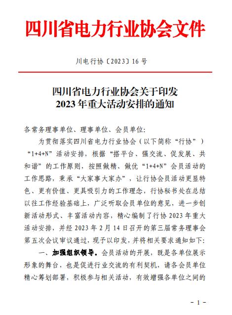 2月22日,四川省電力行業(yè)協(xié)會(huì)(簡(jiǎn)稱(chēng)“行協(xié)”)印發(fā)2023年工作計(jì)劃和重大活動(dòng)安排。2023年,行協(xié)將全面貫徹落實(shí)黨的二十大報(bào)告中提出的調(diào)整能源結(jié)構(gòu)、加快規(guī)劃建設(shè)新能源體系,確保能源安全等要求,全面發(fā)揮好協(xié)會(huì)平臺(tái)、橋梁、紐帶、主體等功能,著力開(kāi)展10項(xiàng)以上重要活動(dòng)。