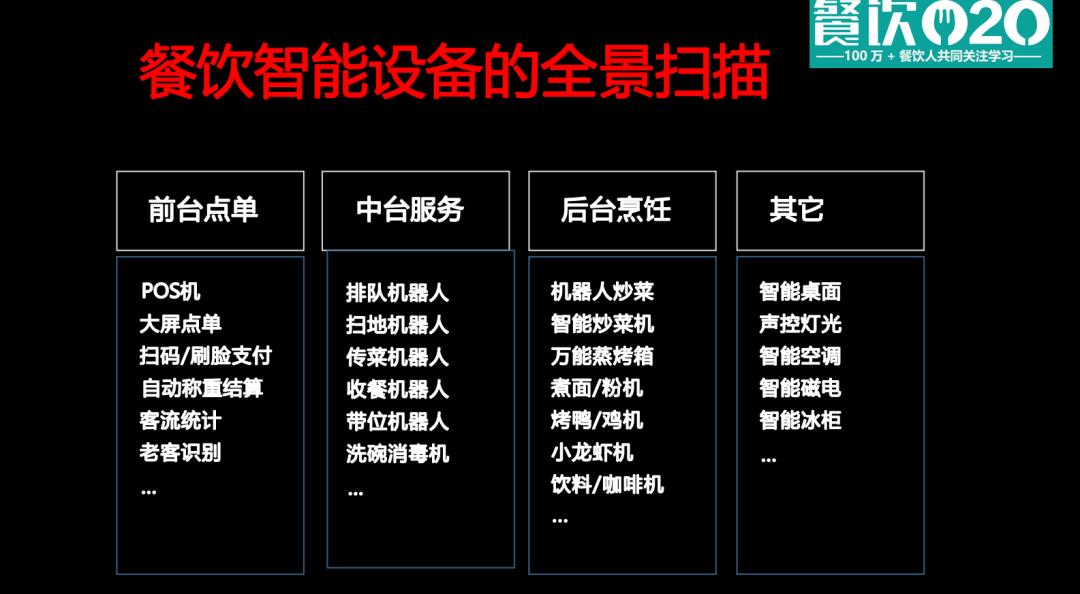 《2023年餐飲設備智能化發(fā)展報告》對餐飲業(yè)的智能設備進行了全景掃描,根據流程環(huán)節(jié)分為四大類:前臺點單、中臺服務、后臺烹飪、其它。餐飲如何做設備智能化?關鍵就是:前臺極致個性化,后臺極致效率化。