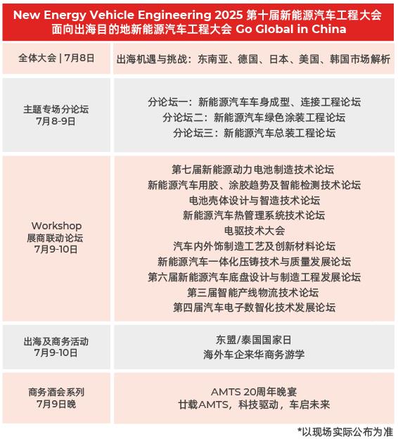 NEV Engineering 2025 第十屆新能源汽車工程大會全新出發(fā),打造:面向出海目的地的新能源汽車工程大會,結(jié)合主辦方勵展全球化汽車產(chǎn)業(yè)合作資源,預(yù)計將吸引4,000名中國及1,000名來自東南亞、日本、韓國、德國、美國、印度及其他海外目的地車企、產(chǎn)業(yè)協(xié)會園區(qū)政府機(jī)構(gòu)等領(lǐng)域的行業(yè)精英,共同探討新能源汽車車身,綠色涂裝、總裝、三電工程及零部件制造工程領(lǐng)域的前沿技術(shù)、市場趨勢、以及出海目的地的政策法規(guī)及合作機(jī)遇,為行業(yè)精英提供一個不出國門即可深度參與的國際交流盛會。