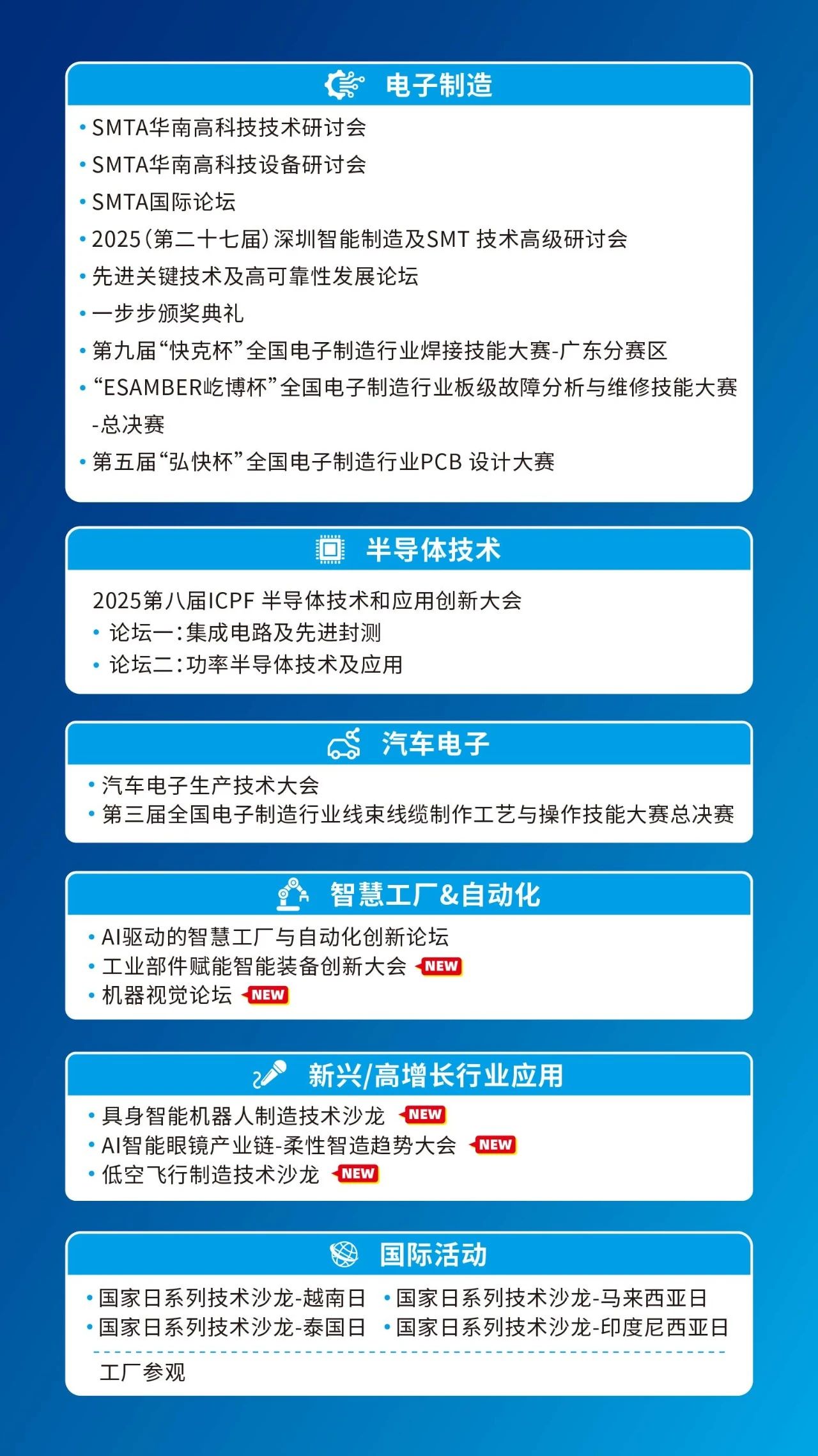 在AI終端、圖像傳感、半導(dǎo)體芯片等關(guān)鍵領(lǐng)域持續(xù)領(lǐng)跑,成功實(shí)現(xiàn)技術(shù)創(chuàng)新與多場(chǎng)景應(yīng)用的深度融合。NEPCON ASIA 2025針對(duì)具身智能機(jī)器人、低空飛行、智能工廠、機(jī)器視覺(jué)、半導(dǎo)體、電子制造等領(lǐng)域開(kāi)展40場(chǎng)會(huì)議論壇及賽事活動(dòng),深度整合國(guó)內(nèi)外行業(yè)協(xié)會(huì)組織、專(zhuān)家、科研人員、資深從業(yè)者、行業(yè)應(yīng)用終端及行業(yè)媒體等資源,探討電子制造現(xiàn)狀與未來(lái)發(fā)展趨勢(shì),實(shí)現(xiàn)業(yè)務(wù)的持續(xù)增長(zhǎng),共同拓展市場(chǎng)新未來(lái)!