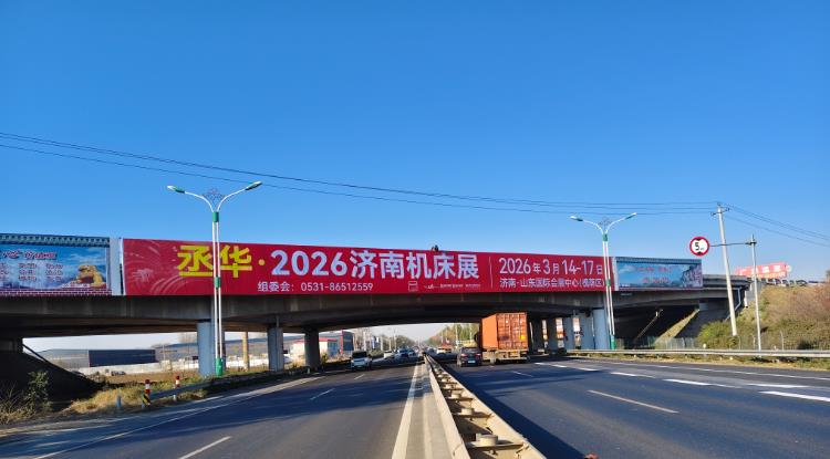 調研數(shù)據(jù)顯示,濰坊地區(qū)專業(yè)觀眾占濟南機床展全國觀眾總量的6%,且采購需求存在較大挖掘空間。基于此,展會在濰坊車流量日均3萬余輛的核心路段布局跨橋廣告,既借助高車流量實現(xiàn)展會大范圍曝光,又精準錨定濰坊產(chǎn)業(yè)帶流量樞紐,串聯(lián)周邊產(chǎn)業(yè)集群,讓展會信息隨車流傳至產(chǎn)業(yè)鏈上下游,為展會吸納更多精準采購商筑牢宣傳根基。